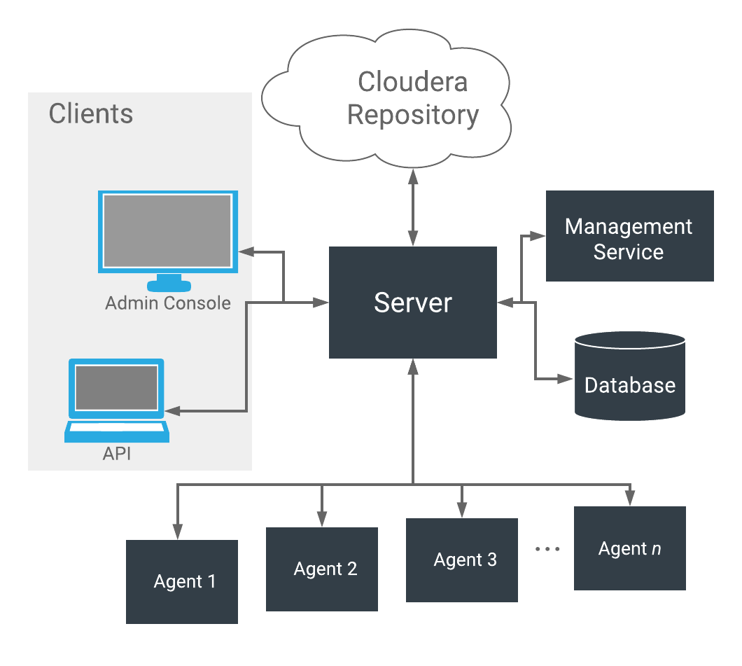 As depicted below, the heart of Cloudera Manager is the Cloudera Manager Server. The Server hosts the Admin Console Web Server and the application logic, and is responsible for installing software, configuring, starting, and stopping services, and managing the cluster on which the services run.