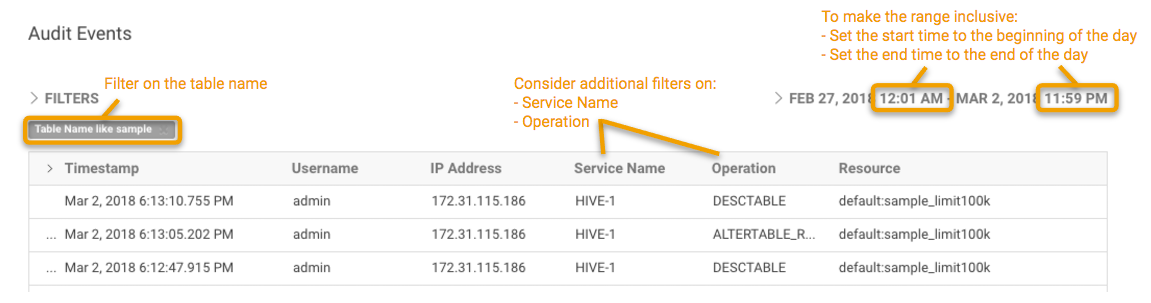 - By Operation. For example, to show only Hive operations that change the table metadata, use Operation like alter.