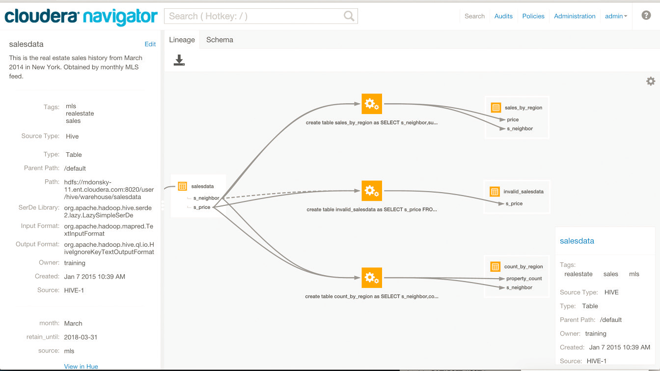 Cloudera Navigator lineage is a visualization tool for tracing data and its transformations from upstream to downstream through the cluster. Lineage can show the transforms that produced upstream data sources and the effect the data has on downstream artifacts, to the column level. Cloudera Navigator tracks lineage of HDFS files, datasets, and directories, Hive tables and columns, MapReduce and YARN jobs, Hive queries, Impala queries, Pig scripts, Oozie workflows, Spark jobs, and Sqoop jobs.